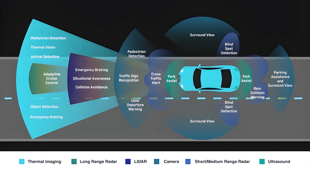 Valeo's Northstar system combines them: thermal handles nighttime pedestrian detection for automatic braking, radar measures distance and velocity, and RGB reads traffic signals.